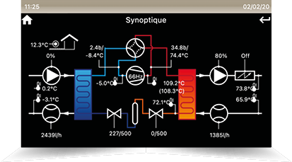 Écran de contrôle d’une pompe à chaleur qui assure les applications suivantes :